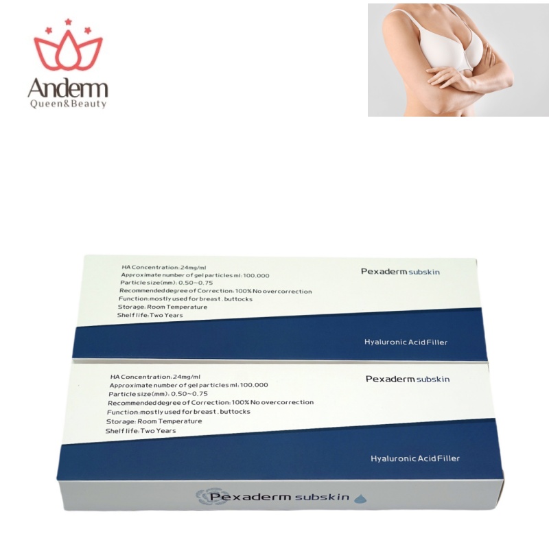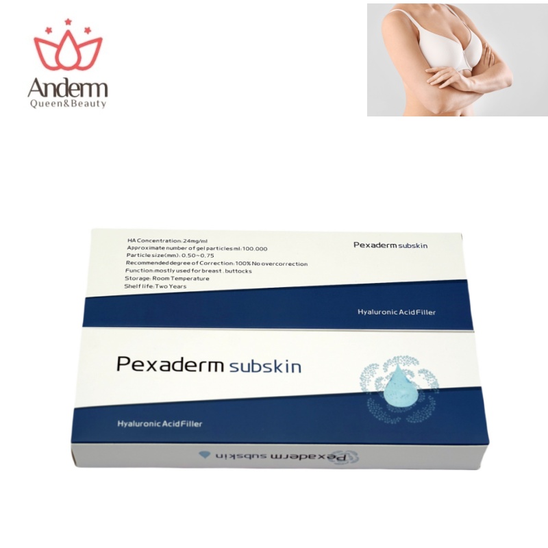 Pexaderm Filler is a kind of cross linked hyaluronic acid dermal filler for breast augmentation, hip augmentation,penis enlargement, and right-angled shoulders.